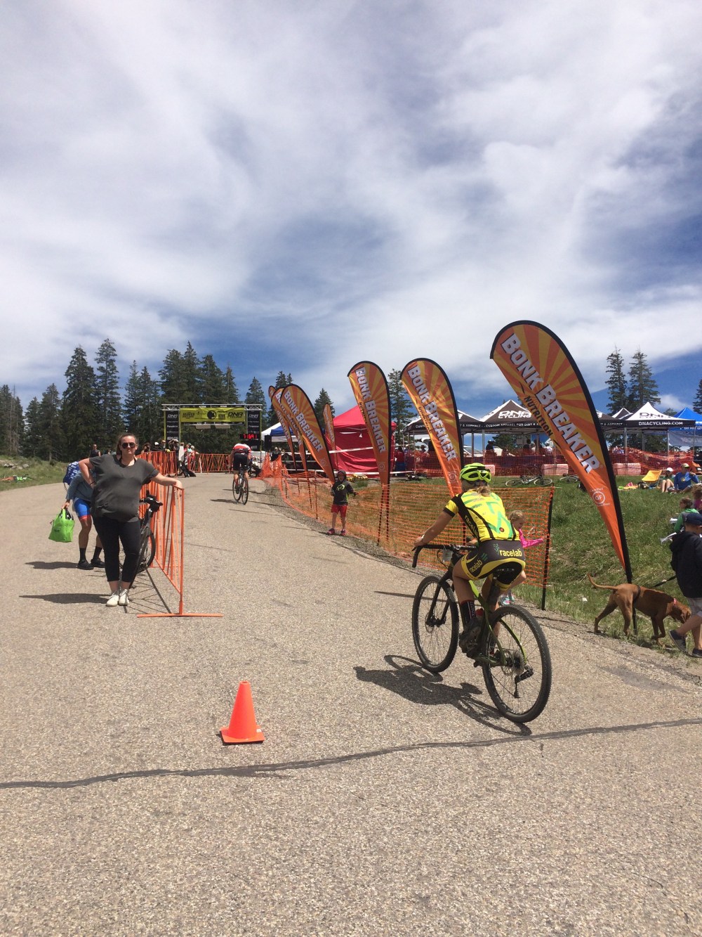 The alarm went off and we were up and out the door after a good breakfast of the usual rice and eggs. We drove down the mountain to downtown Beaver for the start. After the mandatory port-o-potty stop and nervous chatting with friends, both old and new, it was time to line up in the staging area. I gave Danielle a kiss goodbye and a “good luck” as we lined up. The Crusher has a wave start and I would start 4 minutes behind her which was exciting because I would get to see her later in the race. Finally my group was off and pedaling up the road. The first 11 miles are paved with a gradual up hill and it turns into a road race. My age group immediately formed a peloton and started working together. We had a good pace, but not too hard which was nice to get a good warm up in before the real climbing started. About half way up the paved climb another age group flew by us and that was that for the nice warm-up. At that point it was chaos with people jumping from one group to another, jockeying for position, and picking up the pace. The peloton exploded in size as well and now stretched across the entire road (so much for the yellow line rule). After another mile the chaos settled down a bit, but the pace remained high. About this time I caught Danielle and gave her a pat on the back, a quick I love you and another good luck and I pushed on.
